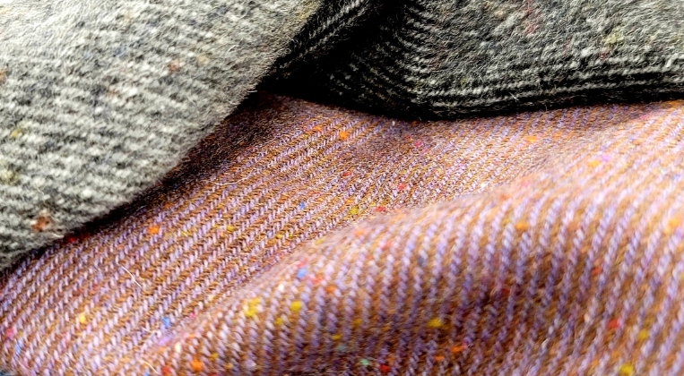 - ストレッチ糸を組み合わせ、シワになりにくく、よく伸び着心地が良く暖かい商品。リサイクルウールを使ったサスティナブルツイード素材です。